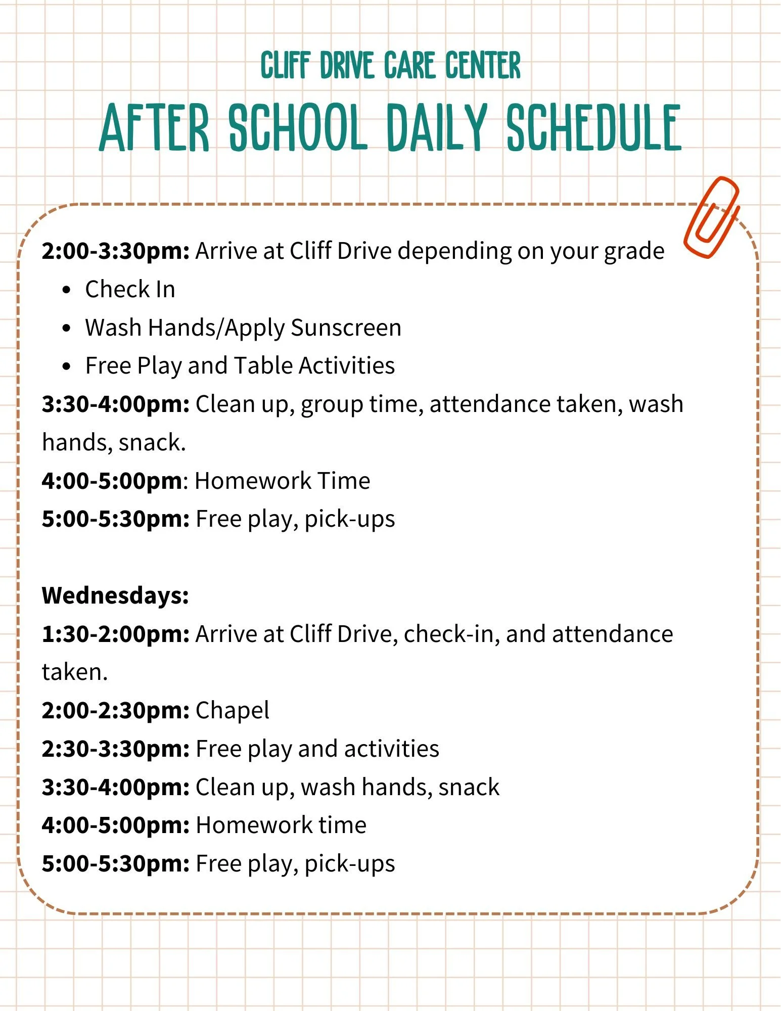 Our After School Program is shaped around providing a physically, socially, emotionally, and spiritually safe place for children in transitional kindergarten through 12 years old. Healthy snacks, arts and crafts, sports equipment, and outdoor play spaces engage the body and the imagination. Homework times and homework help encourage academic development. Our 14:1 child-to-adult ratio allows for one-on-one academic coaching. Chapel and the integration of Biblical stories provide opportunities for spiritual growth. Another aim is to develop cognitive social skills. We intentionally teach empathy and lead children through conflict resolution. We build a cooperative environment, actively working against exclusion or playground power dynamics, teaching children how to work through these situations and put themselves in other people’s shoes. Cliff Drive is much more than a place to be after school; it’s a place to thrive and actively learn.