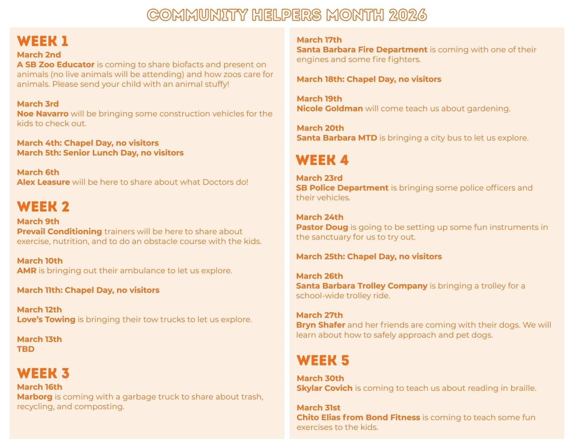 We are excited to welcome several members of our community onto our campus for Community Helpers Month! Starting on Monday, March 2nd, we will have the mornings blocked off for our visitors to share about the work they do with the children. Children in the Infant Center also get to participate. We will have a fire truck, police vehicles, athletic trainers, gardening, a trolley ride, music day and much more! See the calendar below for details.
